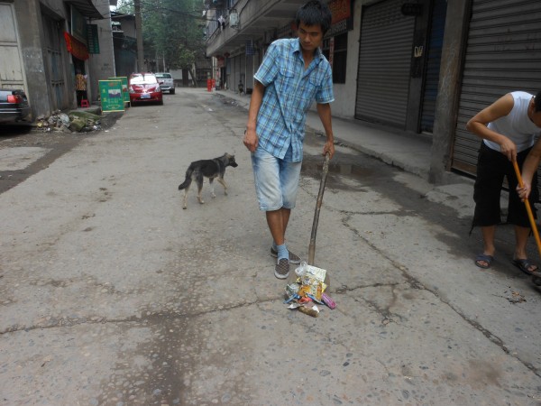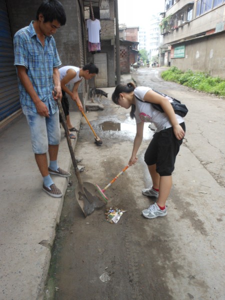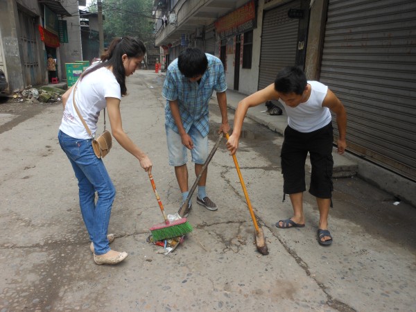 7月15日, “学雷锋精神关爱老人”义务劳动队,依然在早上8:30到达了交通乡敬老院大门口,可大家并不急着进去帮老人干活,而是在巷子外边停住了脚步。因为大家发现巷子很脏,垃圾随处可见,所以志愿者们商量决定给敬老院附近的巷子进行一次大扫除。于是志愿者们开始弯腰捡路上的垃圾,有些则跑到院里拿来扫把和簸箕,开始了如火如荼的大扫除。打扫期间,队长讲到:“我们是学雷锋精神,不仅帮敬老院里面的老人家,也要帮周围的居民,而且更是希望通过我们的行动号召和感染附近居民,爱护自己生活的环境,树立爱护环境人人有责的思想,一起维护干净、舒适的环境。”