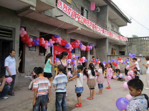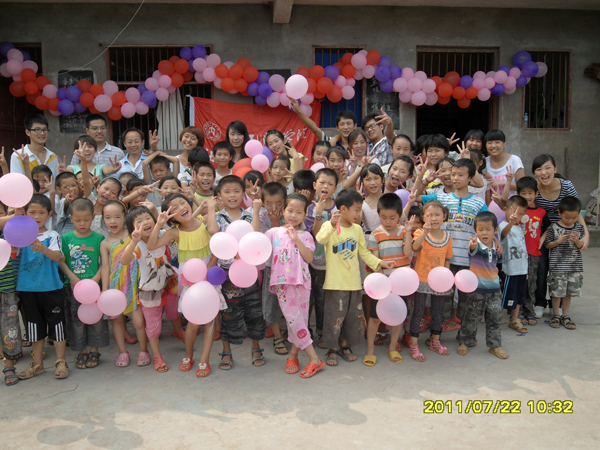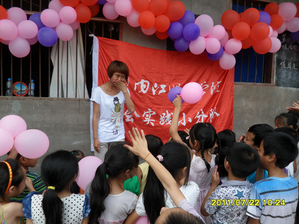 8点半,志愿者们简单整理行李后,一部分便组织员工开始吹气球,布置舞台,另一部分则和员工们一起排练起了欢送会的节目。10点左右,一切布置妥当,一条彩色气球串成的长龙横挂在舞台前方,欢送会开始。志愿者让员工们在操场上手拉手围成一个圈之后,开始表演准备已久的节目。二年级同学们表演的舞蹈“踏浪”、志愿者与员工一起表演的欢快的兔子舞、歌曲“童年”和“娃哈哈”、男生表演的拳术等节目一一上场,操场上欢呼声、掌声不断,志愿者与小员工们融在一起。节目的最后,支教队员与小朋友们齐声高唱感恩的心,将欢送会推向高潮。表演结束后,董事长高成福代表全校师生们向我支教团队表示感谢,他说:“感谢你们的到来,你们给孩子们带来的知识和欢乐,让我们老师看到了新一代的朝气与活力,更带来太阳成集团tyc151cc的关怀和祝福,谢谢……”。并向团队赠送写有“义务支教 造福学子”的锦旗。他希望我们明年再来公司支教。指导老师杨荣金上台接过锦旗并与高老师亲切握手,表达了对高老师和小员工们的感谢。他感谢东风小学师生给志愿者们提供一个锻炼自我的机会。带着沉重的心情,所有志愿者一一上台向员工道别,鼓励小朋友们好好学习,将来能考上自己理想的大学,实现自己的愿望。最后,志愿者与员工们拍照留影,记录下这难忘的时刻。也为这次暑期三下乡“建党九十周年爱心义务支教”义务支教之行画上了圆满的句号。