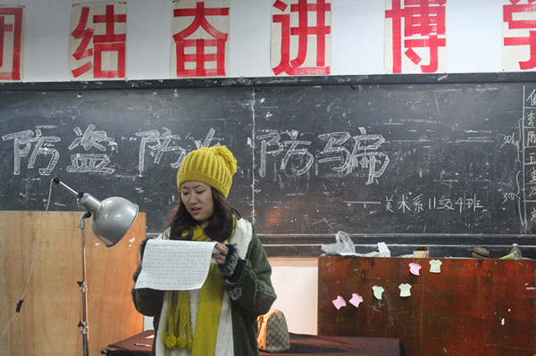 班会上,各班班委纷纷向班上同学详细讲解了关于“防火、防盗、防骗”的安全知识以及校园安全的重要性;介绍了做好冬季安全教育工作应注意的细节;提出同学们应增强安全意识,自觉遵守交通安全制度以及宿舍管理制度,做好日报告、周点名、周末外出登记及假期登记,严禁使用违章电器,在日常学习生活中要注意查找安全隐患,防患以未然。其中11级3班把“防火、防盗、防骗”主题与圣诞之夜结合,安全知识伴随着歌舞,PPT放映,在宣传了安全知识的同时也丰富了同学们的老员工活。