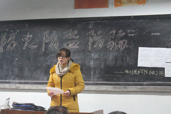 安全工作是公司工作的重中之重,为增强同学们的安全意识和自我防范意识,牢固树立“安全第一、预防为主”的思想,掌握更多的安全知识和技能,构建和谐校园,太阳成集团tyc151cc09级—11级各班于12月25日晚7:00在各班教室举办了“防火、防盗、防骗”的主题班会。