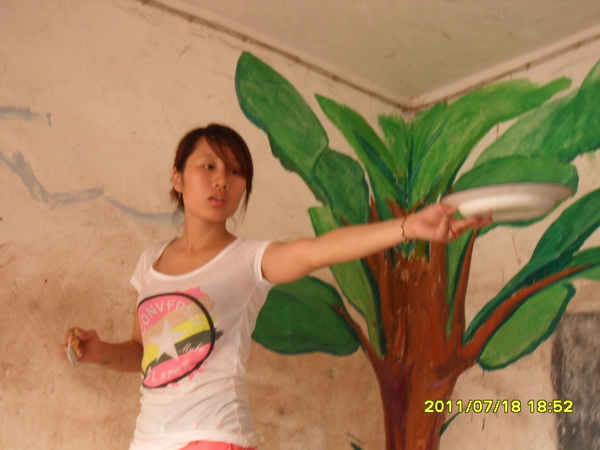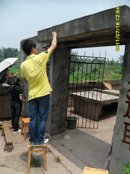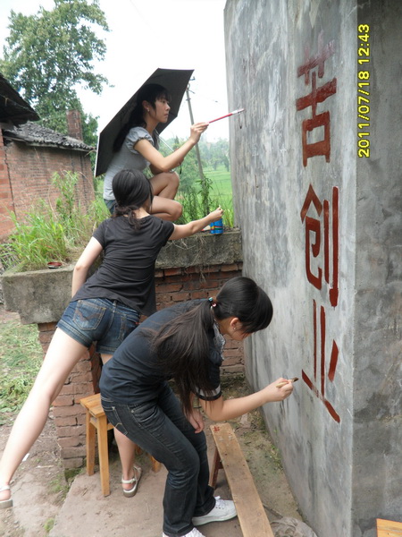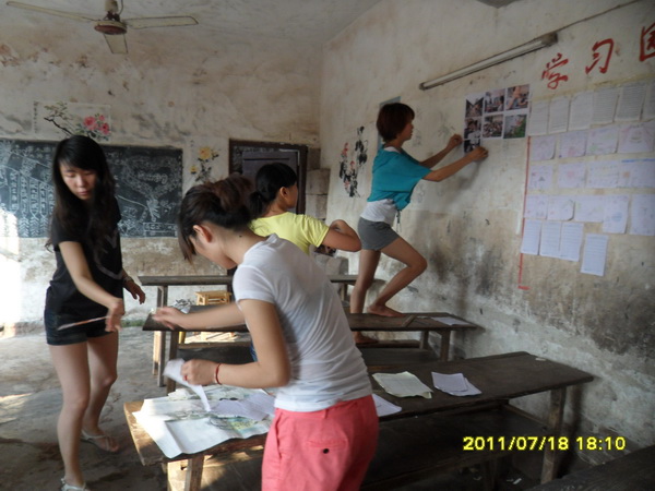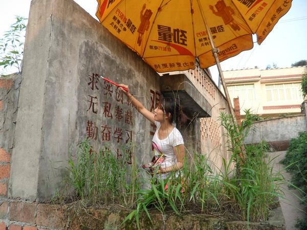 除了学习辅导外,今天志愿者们还有一个重要的任务——打造爱心校园。由于该校属于私人办学,而且校舍由一般居民楼简单改造而成,因此,教室甚为简陋。为了给小员工们营造一个舒适温馨的学习环境,11名志愿者经过商量并征得该校董事长高成福同志同意后,决定利用自己的专业优势为员工们装饰教室和校园。简单的午饭后,志愿者们不顾炎热,开始了这项爱心工程。他们先将教室打扫干净,然后男志愿者拿出事先准备好的刷子和颜料,按照事先设计的图案画起了墙绘。志愿者聂国一边画一边说:“我想让孩子们一走进教室就能感觉到爱的气息,希望他们在漂亮、温馨的教室里学习和成长。”而女志愿者也没闲着,她们将与孩子们拍的合照全都洗出来,并将一张张笑脸拼成了一个大的心状图案,象征着孩子们与志愿者一起的快乐,并将其贴在教室前面的墙上。最后,为了让员工们了解更多知识,又在教室安装了多媒体。装饰完教室,同学们又开始美化校门。由于长时间日晒雨淋,校门上的公司名称、标语等字体已经褪色,看不清楚。同学们拿出自己买来的油漆,顶着烈日,认真地勾画着每一个字。另外,支教结束时,志愿者们还将在教学楼外墙上绘制一幅大型墙画,作为纪念。
