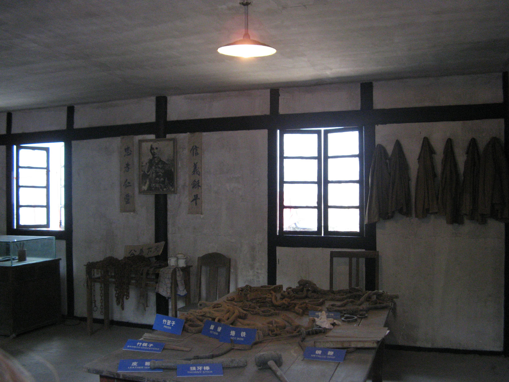 渣滓洞,原为人工开采的小煤窑,因渣多煤少而得名。这里三面环山,一面临沟,地形隐蔽。进入大门,沿着蜿蜒的山路我们来到了目的地,我们怀着崇敬的心情来到了监狱门口,监狱四周两米多高的围墙上是带电的铁丝网,戒备森严。围墙里面分两部分:靠外的是个四合院,是国民党看守人员办公与住宿的地方。里面一幢两层楼房是关押共产党政治犯的地方。楼上楼下每个房间的门上贴着关押过的革命者的名单。房间陈列着先烈们的遗像及遗物。那么多的革命者,都是我党的栋梁之材,他们肩负着党的重任。都是那么年轻,那么有才华,那么美丽。但是他们为了共产主义的伟大理想,为了新中国的解放,坚贞不屈的斗争着,付出了自己宝贵的生命。