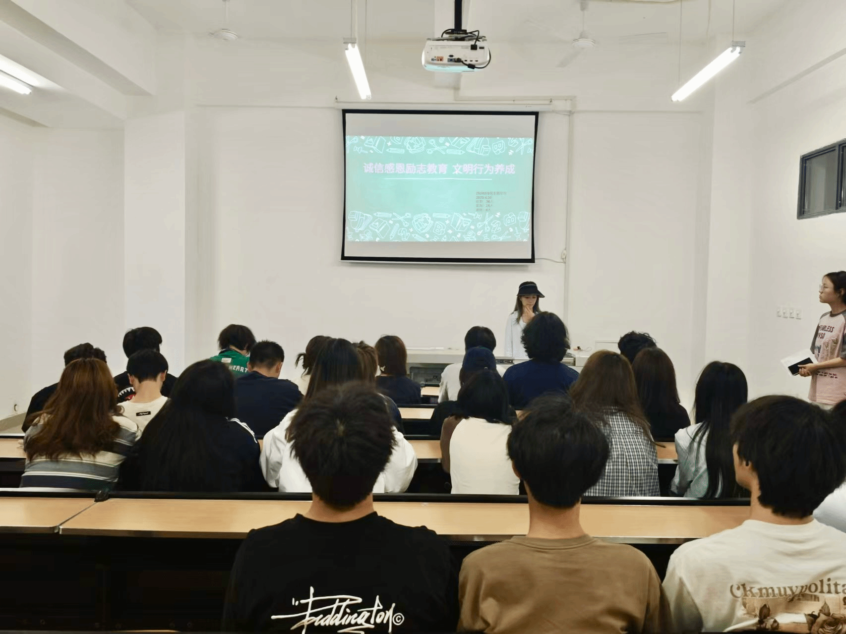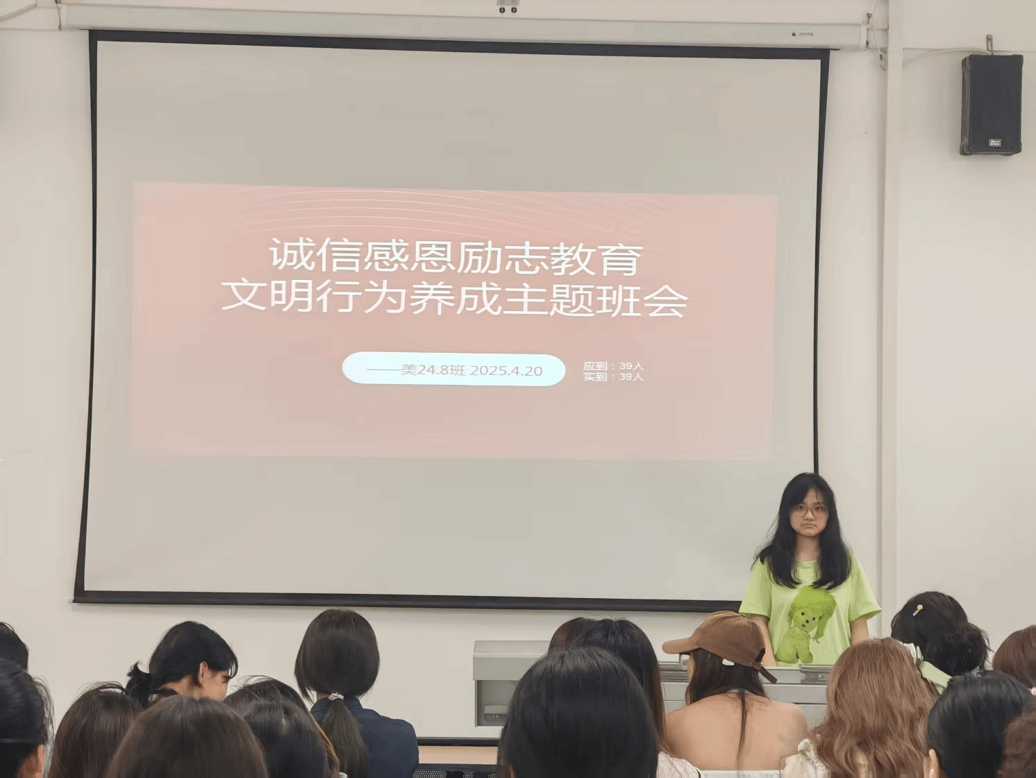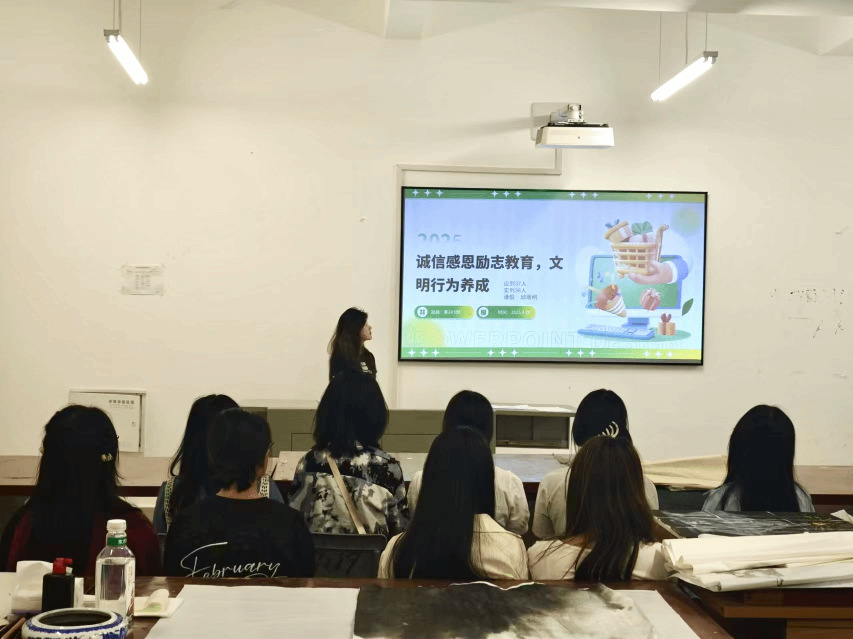 在班会上,各班团支书鼓励同学们从按时守约、信守承诺这些事去践行诚信。作为艺术专业的同学们不但需要夯实专业根基,更要担当起文化传承的重任。在艺术作品创作中融入诚信元素,凭借作品呈现诚信之美,使观赏者领略诚信的力量,进一步推动中华诚信文化的发扬与传承。