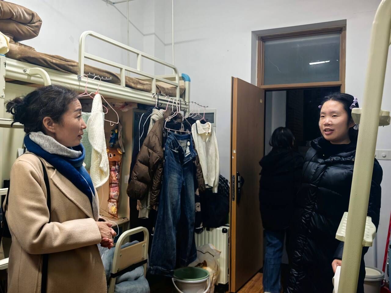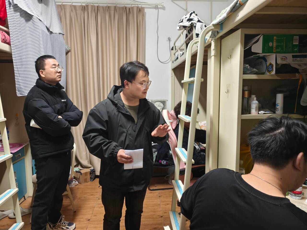 检查过程中,领导老师们与同学们亲切交流,细致询问住宿适应、生活需求和学习状况,鼓励大家互帮互助、团结友爱,共同营造整洁、安全、温馨的寝室氛围。