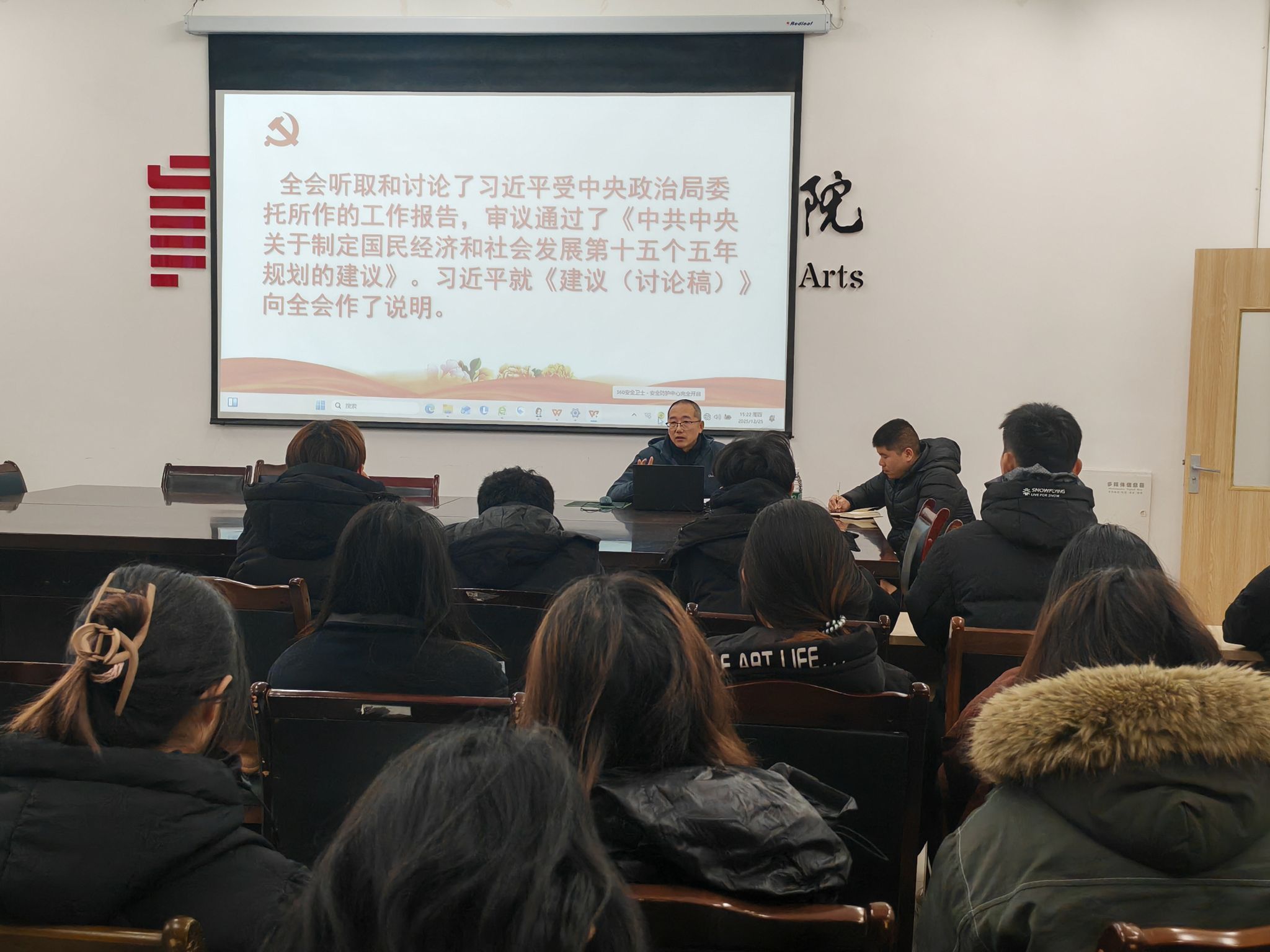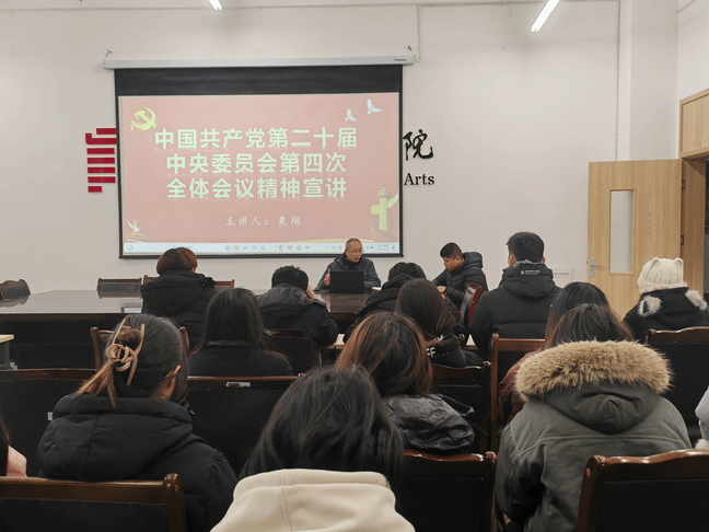班会后,粟翔副馆长结合自身工作与思考,以“锚定时代坐标,赋能设计成长——视觉传达设计专业老员工深学细悟党的二十届四中全会精神”为主题开展专题讲座。他紧扣国家发展大局与行业前沿趋势,从校准创作方向、升级技能结构、拓宽职业赛道、塑造价值坐标、树立正确就业观念五个维度进行了深入讲解,鼓励大家勇于探索传统文化与数字技术的融合创新。