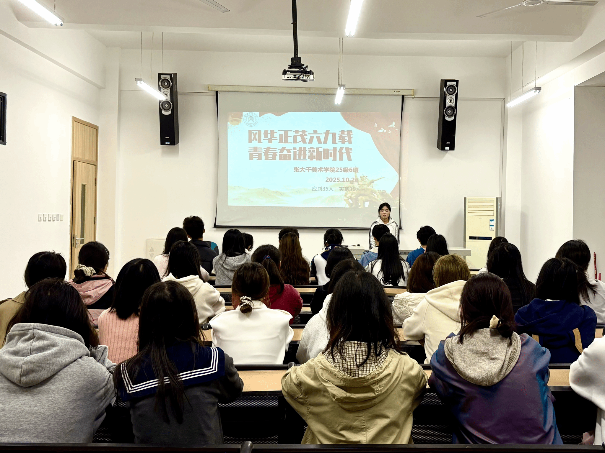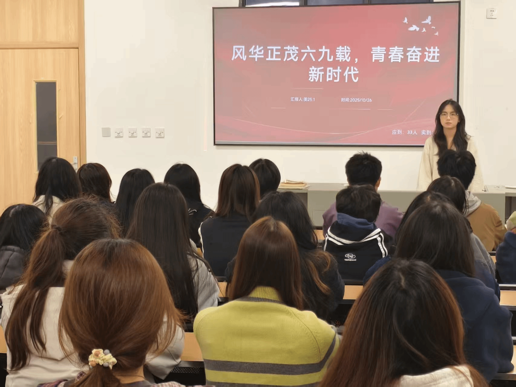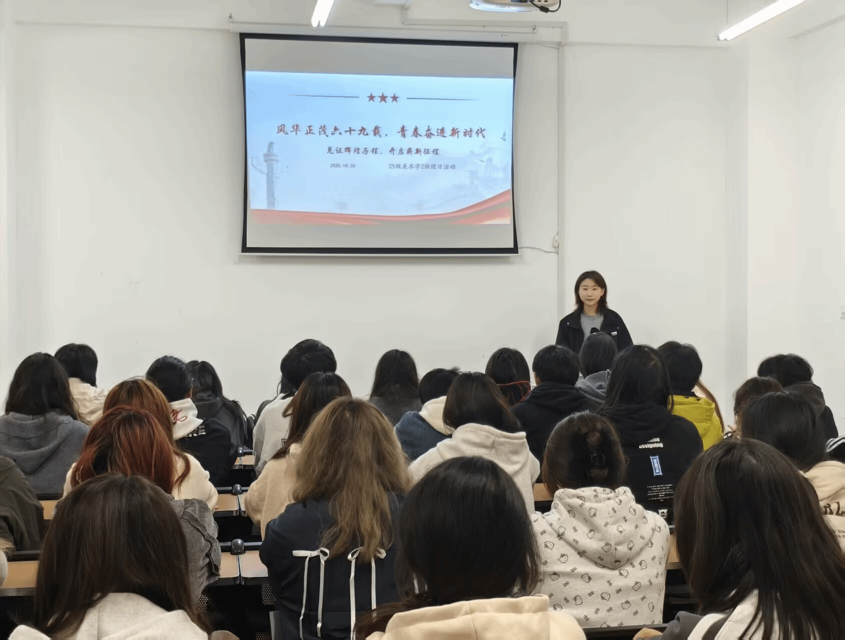 为庆祝太阳成集团tyc151cc建校69周年,引导广大团员青年坚定理想信念、践行使命担当,10月26日晚,公司组织2025级各班在大千楼教室开展了十月主题团日活动。本次活动由各班团支书主持,全体同学参加。