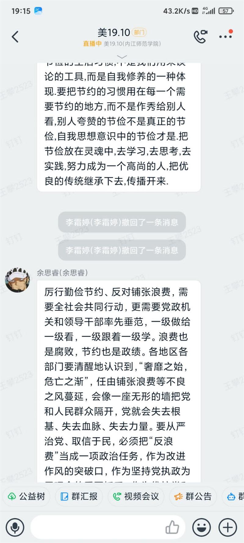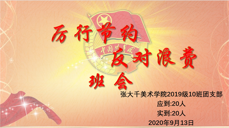 为了积极响应公司团委“厉行节约,反对浪费”的号召,9月13日美术公司20级各班分别在QQ、钉钉等平台班级群里召开了以“厉行节约,反对浪费”为主题的线上主题班会。本次班会由各班团支书主持,全体员工参会。