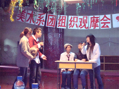 活动第一项,团组织观摩会。节目由07级各班均出一节目,共有8个节目。节目形式多样有小品、相声、歌曲、舞蹈、音乐剧等。具有异域风情的舞蹈《印度少女》、意趣横生的相声《探亲》、幽默滑稽的小品《二傻相亲》等等。在活动中,还进行了共青团知识和公司评估知识问题的考查,同学们积极踊跃,对知识的掌握普遍很牢固。