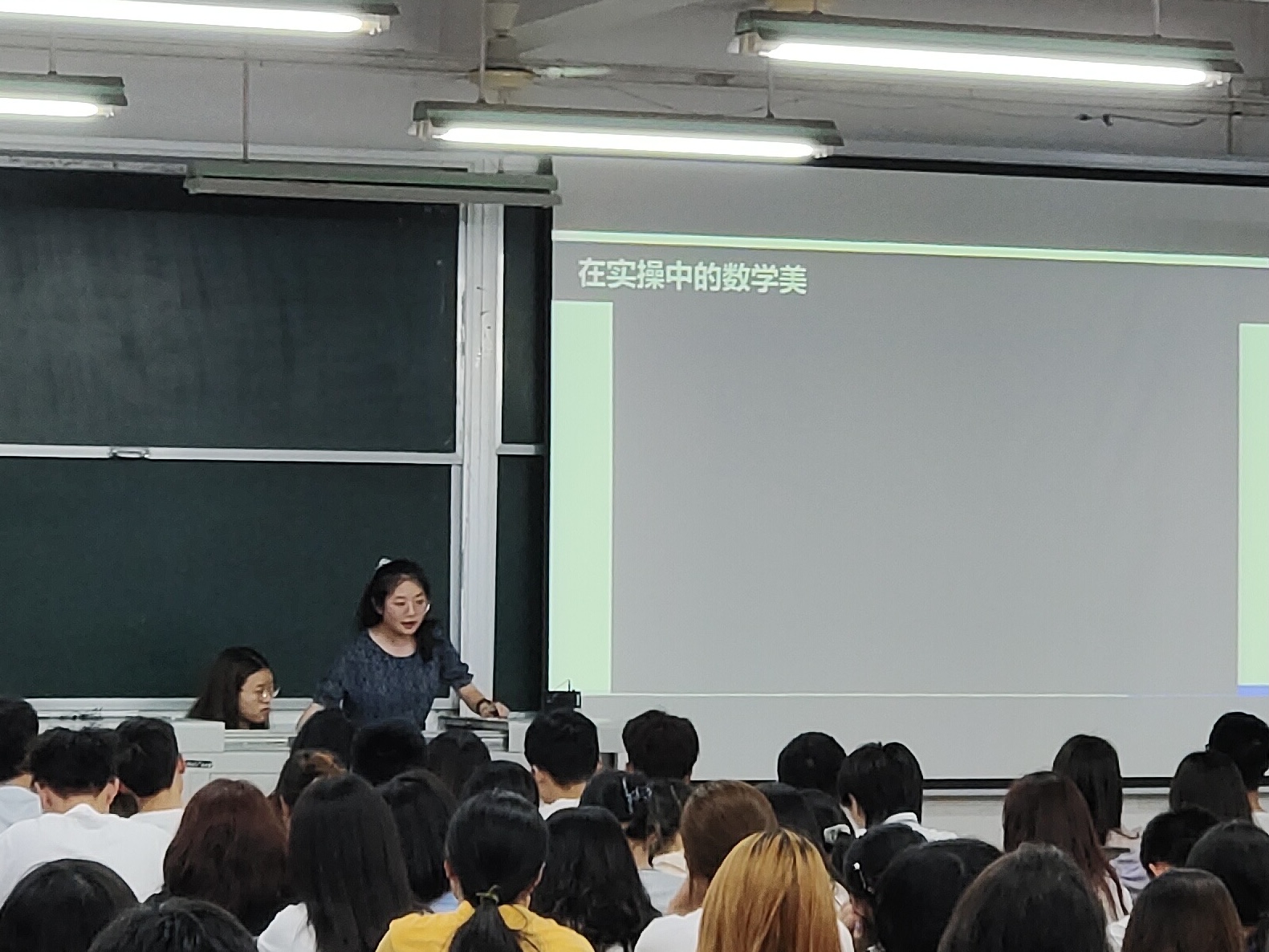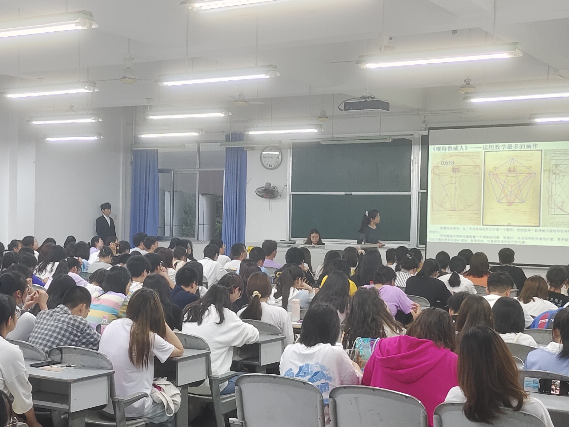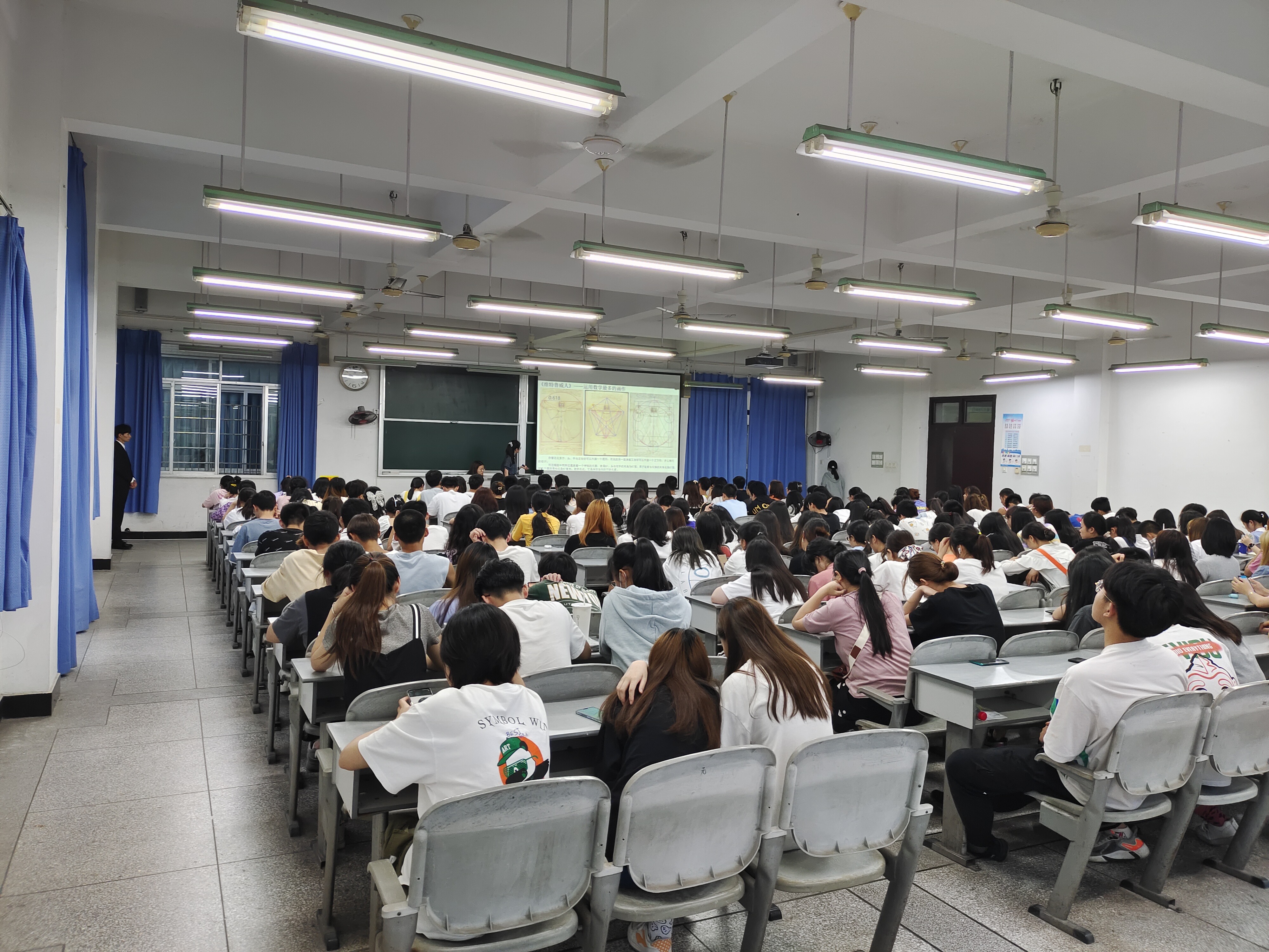 在同学们热烈的掌声中,讲坛正式开始。主讲人向同学们询问对数学的看法,同学们似乎是回想起了自己为一道道数学题抓耳挠腮的“痛苦时刻”,一声“难~~”脱口而出。看着眉头紧皱的同学们,主持人在悠扬的音乐中,缓缓向同学们展示了诗中的数学、画中的学习、音乐中的数学以及生活中的数学、文学、艺术、生活与数信的完美交融,让同学们充分感受到了数信之美。在同学们的惊叹声中,主持人鼓励大家要积极学习各种知识,优秀的专业成绩离不开其他知识的丰富,同学们表示:在今后的学习生活中将学习各种知识来充实自我,将其与自身专业知识融会贯通,碰撞出美的火花。