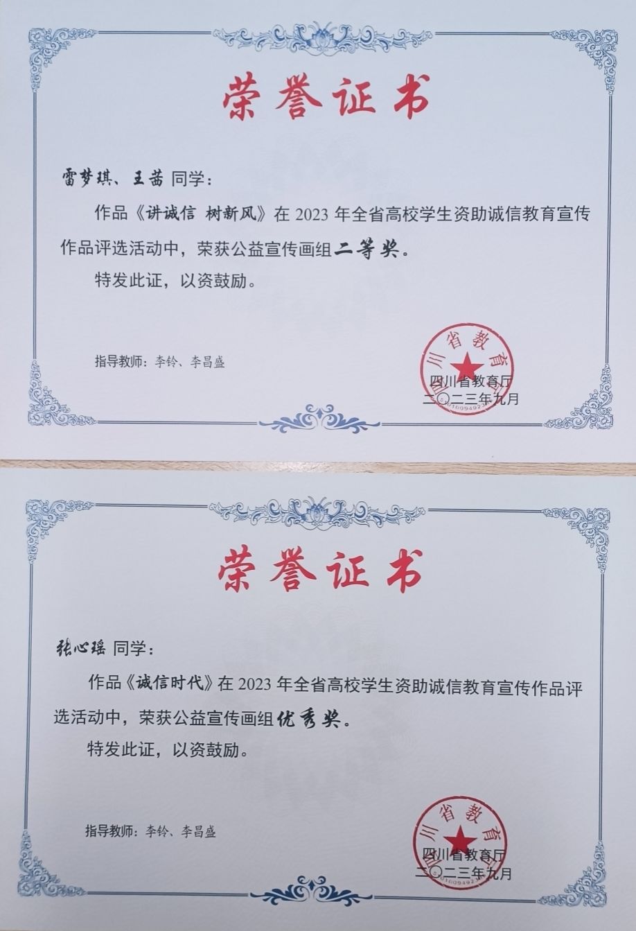 为充分发挥资助育人功能,进一步提高员工诚信意识和责任意识,四川省教育厅联合中国人民银行四川省分行开展了2023年全省高校员工资助诚信教育主题活动,全省105所高校共遴选推荐诚信教育宣传作品480件参加最终评选,其中公益短片138部,宣传画182幅,成人之美故事160篇。