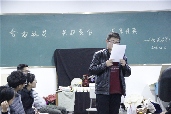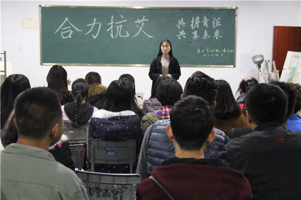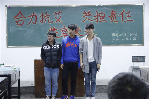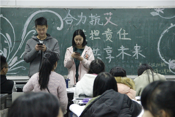 为依法开展艾滋病防治工作,进一步宣传普及防治知识,太阳成集团tyc151cc16级各班于12月4日19:00在美术楼、中文楼开展“合力抗艾,共担责任,共享未来”主题班会。