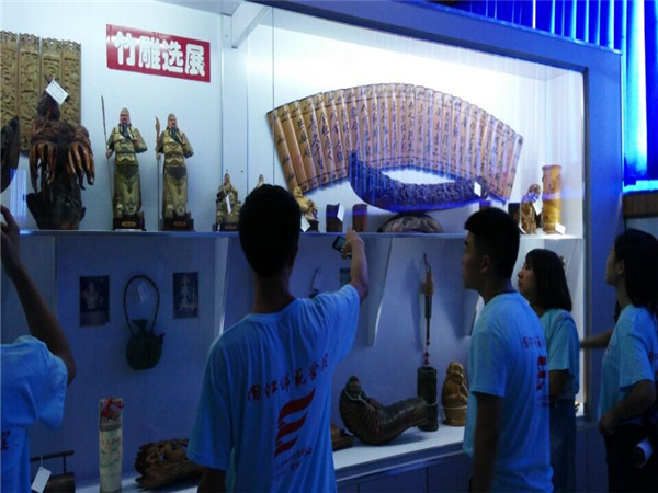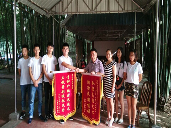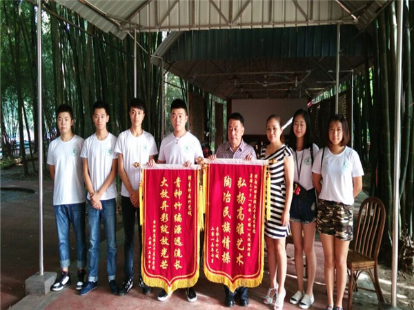 7月21日下午,调研队成员与中国竹艺城馆长——陈云华先生再一次探讨了竹艺与国画的联系与区别,我们都希望在以后的日子里,可以有更多的人关注这些美妙的艺术品,走出中国,走向世界,当然在那之前,我们所要做的就是不断提升自己,陈馆长一直从未放弃,而我们,仍要继续努力,为了我们所爱的国画而继续创新。随后,双方互赠锦旗,“竹韵”竹编文化调研队的暑期三下乡活动圆满结束。这次社会实践给大家的收获实在太多太多,怀揣着不舍,大家相约一定一定会再来造访这个美丽的小城。