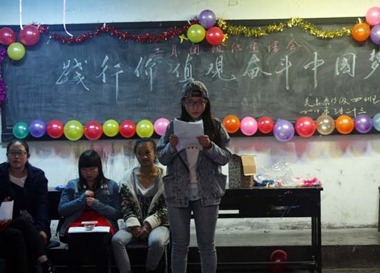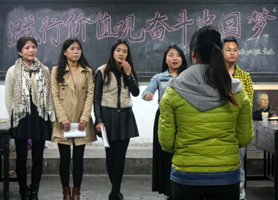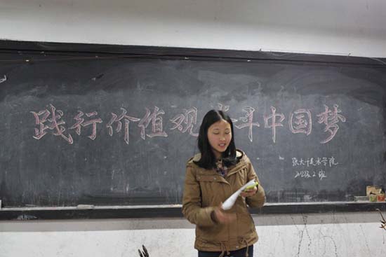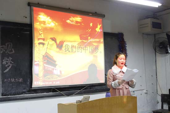 首先,由各班团支书以讲述的形式让同学们了解了实现伟大中国梦,树立正确世界观、价值观和人生观的重要性。并通过诗朗诵、舞蹈、唱歌、演讲等方式向大家表达了中国梦的理解。其中12级3班同学的舞蹈表演让众人欢呼声掌声不止,13级4班数名同学的诗歌朗诵《共筑中国梦》更是深入主题,使大家对中国梦有了更为深刻的认识。激情洋溢的合唱、精彩有趣的互动,更是赢得同学们热烈掌声,将主题班会一次次推向高潮。