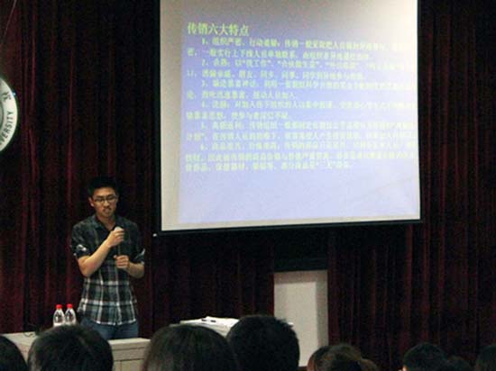 随后,报告会正式开始,陈彬耀围绕自己的亲身经历详细讲述了传销的本质、传销的特征和特点、以及一些骗子常用的骗术和手段,并讲解了如何防骗、防传销的具体措施。最后,他希望师弟、师妹们在将来找工作时,提高安全防范意识,不要给不法分子可乘之机,并祝愿大家学习进步、身体健康。