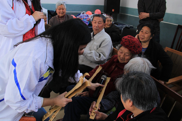 紧接着,公司服务队为老人们带来细心编排的文娱节目。欢快动听的歌曲、葫芦丝演奏、青春洋溢的健美操和精彩的京剧《梨园春晓》等表演,赢得了现场阵阵的掌声和赞叹声。在其间的互动环节中,老人们和志愿者击鼓传花,被选中的老人展示才艺并分发奖品,现场温馨、愉快的气氛把活动推向了高潮。最后,老人们合唱了一首《老年公寓,我把晚年托付给你》,这首歌曲表达了他们对敬老院的热爱,以及对一直关心着老年人的社会各界人士的感谢。