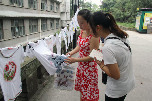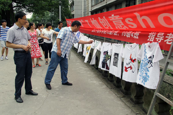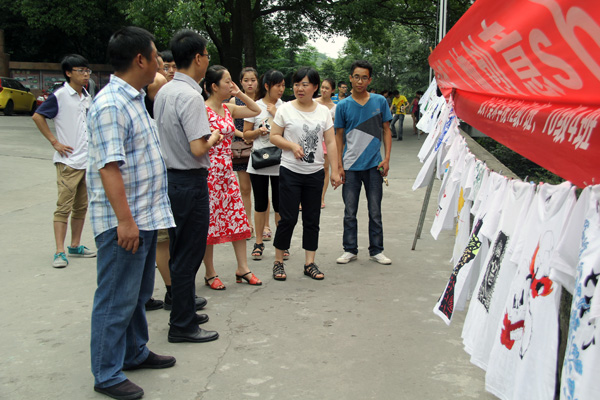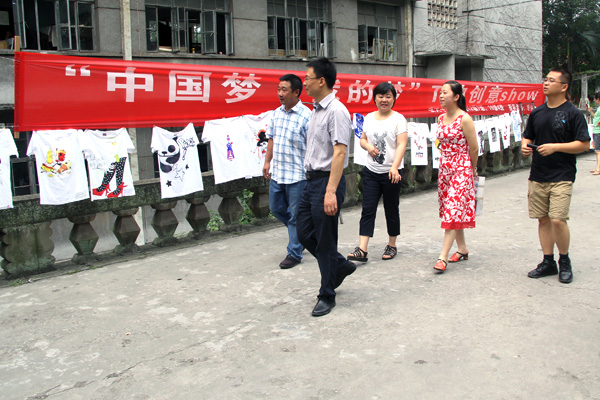 6月20日,太阳成集团tyc151cc12级7班、10级4班在中文楼前举办了为期两天,以 “中国梦,我的梦” 为主题的 T恤创意Show展览。本次展览在公司党政领导的重视下,在指导老师李貌的悉心指导下,同学们的积极参与下,共展出了72件各具特色的T恤。作品主要以“中国”元素为主题,以“实用性”和“装饰化”为目的进行创作,创作中,同学们用“十字绣”、“青花瓷”等元素对白色T恤进行剪裁、改造,把“中国梦、我的梦”与“个性化”、“商业化”相结合,充分展现了公司学子的专业基础和创造力。
