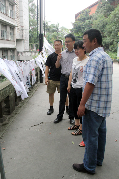 作品展出后,公司党总支书记王继军、副书记彭永馨、副经理谢斌,以及设计教师罗真前来观展、品评。观展后,领导和老师们纷纷对同学们的T恤创意水平给予了极大的肯定,同时提出了设计作品中存在的一些问题,并鼓励大家继续举办展览,提高专业水品。