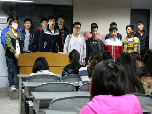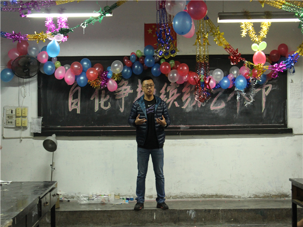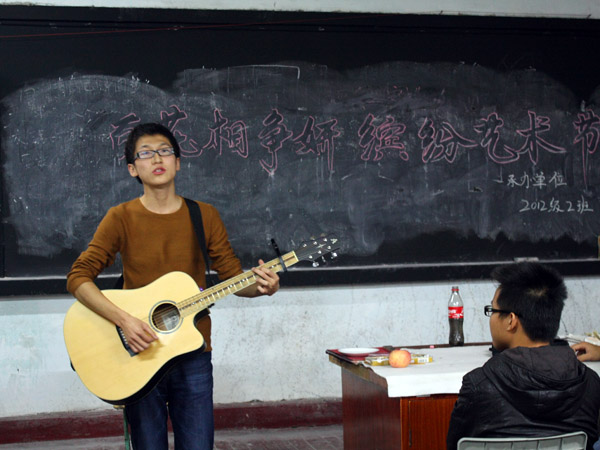 本次主题班会在各班班委的精心准备下准时开始。各班级准备的节目形式多样,内容丰富,有别具特色的民族歌曲、铿锵有力的军歌、神奇多变的魔术表演、声情并茂的吉他弹唱和活跃气氛的游戏等等。在表演过程中,同学们积极参与、尽心表演,将整个主题班会推向了高潮。值得一提的是11级8班和12级2班同学吉他弹唱表演,他们那浑厚有力、富有穿透力的歌喉和动情的吉他弹奏,吸引了同学们的眼球,同时赢得了大家的掌声和称赞。