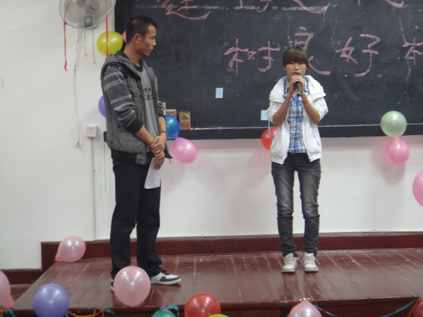 班会在刘静林同学的激昂陈词中拉开帷幕。随后,各班同学都准备了精彩的节目。2011级7班、8班同学分别以流行街舞、手语、小品、歌曲、有奖竞猜等向大家展示了一个朝气蓬勃、团结和谐、自强自信的班集体。其中7班志愿者协会成员表演的《隐形的翅膀》的手语表演尤为触动人心,在优美的手姿下,无声的语言透出无限感动。在整个活动中,大家积极参与,踊跃表现,形式丰富多彩、内容独特新颖。