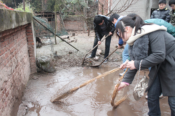 宣誓仪式结束,大家拿起扫帚,齐心协力打扫公司卫生,由于公司条件差,再加上下雨,稀泥污水堵满校内的道路,志愿者们就用手中的扫帚,一下一下地把水扫出去,功夫不负有心人,经过大家的艰苦努力,终于为小员工们创造了一个干净整洁的校园环境。