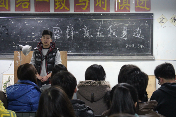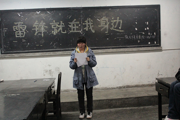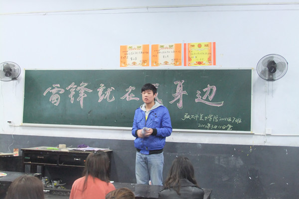 各班团支部的认真准备,使这次主题班会达到了预期的效果。在班会上,各班团支书、组织委员通过回顾雷锋同志的先进事迹,重温了雷锋同志无私奉献、默默无闻的崇高精神,阐述了“助人为乐、勤俭节约、钉子精神、集体主义、敬业爱岗”为内涵的雷锋精神在新时代的体现,号召同学们向雷锋同志学习,从自我做起,从身边做起,争做一名优秀的社会主义事业接班人。各班同学们纷纷自发走上讲台,讲述了自己对雷锋精神的认识,并表示将在今后的学习生活中从身边做起,从小事做起,践行雷锋精神,让雷锋精神永存,并把他发扬光大。最后,各班班长对本次班会进行了总结,强调同学们深刻把握好雷锋精神在当代的新内涵,在学习和生活中学雷锋,讲奉献,争优秀。