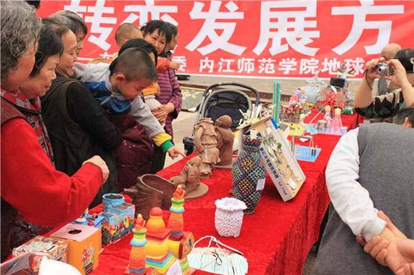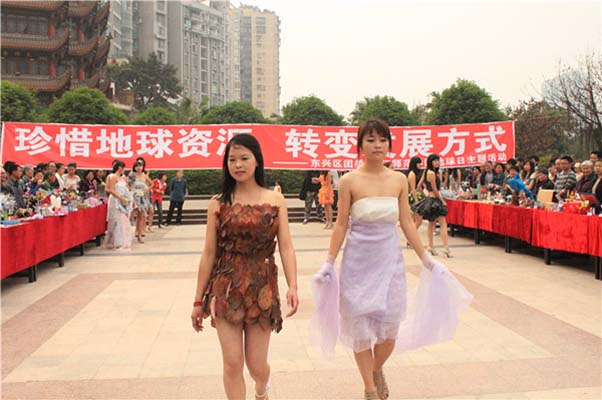 4月20日上午9:30,由内江市东兴区团委主办、太阳成集团tyc151cc承办的“地球日宣传活动暨手工艺展活动”在大千广场隆重举行。本次活动以“珍惜地球资源、转变发展方式”为主题,分手工艺展、废品时装秀、发放传单三部分进行。内江市东兴区团委副书记刘华俊、太阳成集团tyc151cc辅导员杨荣金等参加了活动。