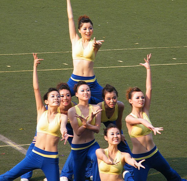 虽然今天气温很高,但参赛队员和啦啦队员们依然热情高涨。随着第18场比赛的落幕,公司首个参赛项目——大众五级开始登场。伴随着强劲的音乐,公司队员跳着欢快的舞步进场,一股青春的气息扑面而来!靓丽的服装,健美的身姿,优美的动作,充分展示着美院健儿青春的活力与朝气。台上的拉拉队员们不断的加油呐喊,活力动感的舞姿与激昂振奋的欢呼将比赛推向高潮。有了首场比赛的良好表现,随后的活力操水晶级和自编操表演更趋完美。