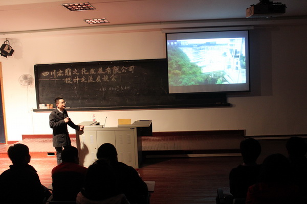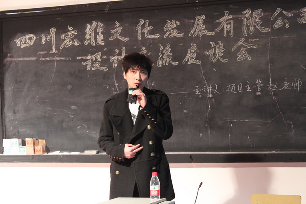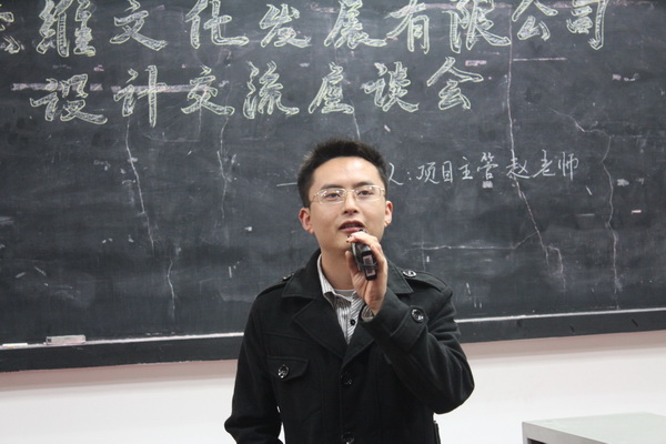 12月3日晚7:00,四川宏维文化发展有限公司与公司共同举办的“设计交流座谈会”在红楼401举行,四川宏维文化发展有限公司项目主管、培训指导师赵春林,培训指导师曹兵,公司党总支副书记彭永馨、学工办主任李仰锐,以及11级6、7、8班全体员工参加了座谈会。座谈会由彭书记主持。