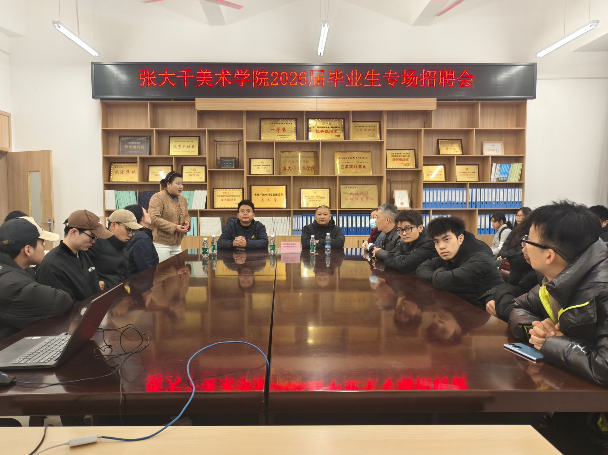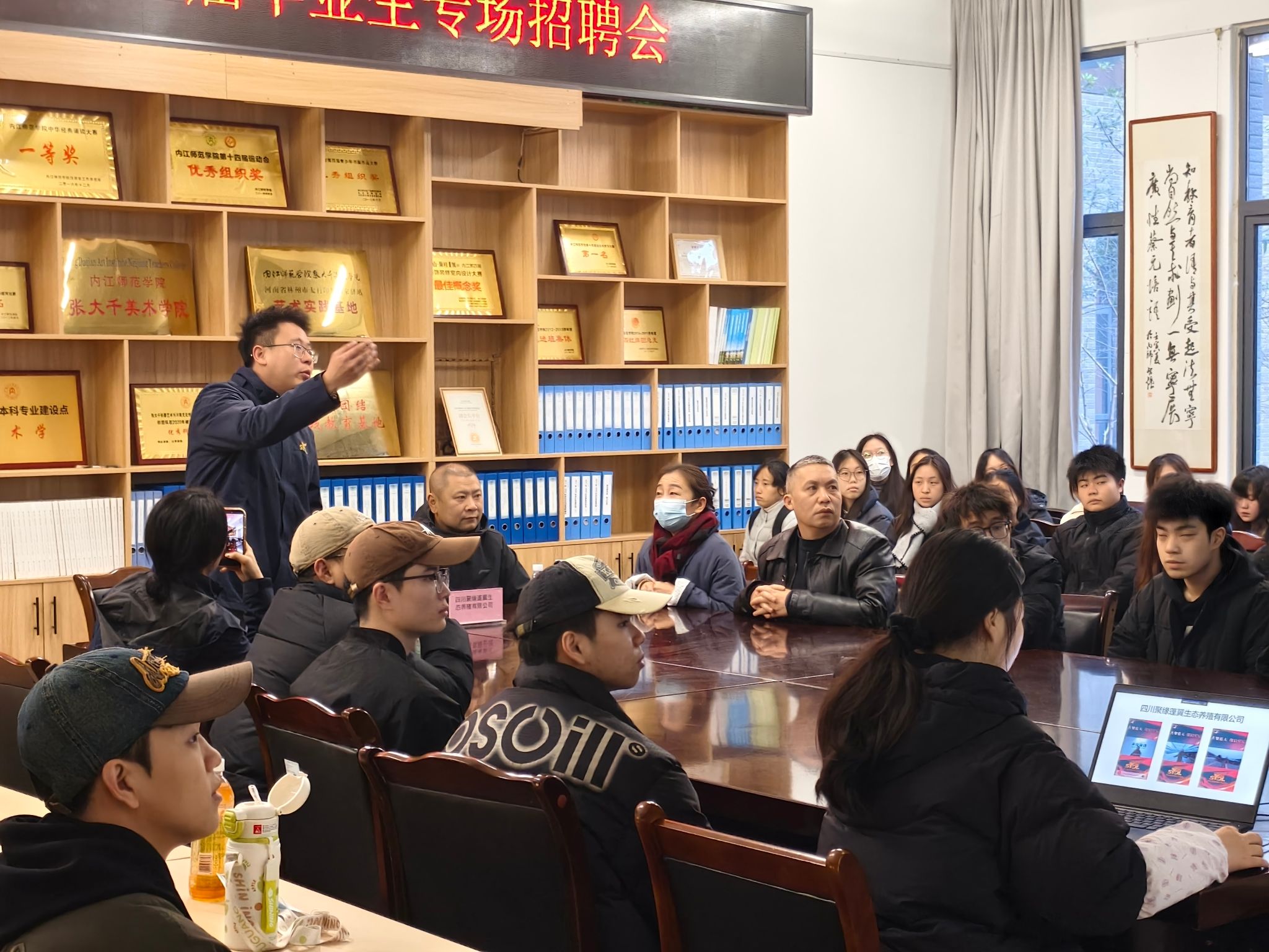 为进一步拓宽毕业生就业渠道,深化校企合作育人机制,助力学子实现高质量就业,12月12日上午,四川聚缘蓬翼生态养殖有限公司专场招聘会在公司大千楼A109教室举行,公司党委书记李欣遥、副书记汪隆友、学工办辅导员李铃、油画专业教师戴祥勇以及2026届毕业生共同参加。